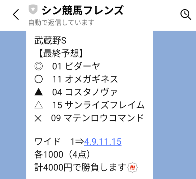 11月15日(土) 【武蔵野S】 ワイド的中 7,000円 獲得🎯 |